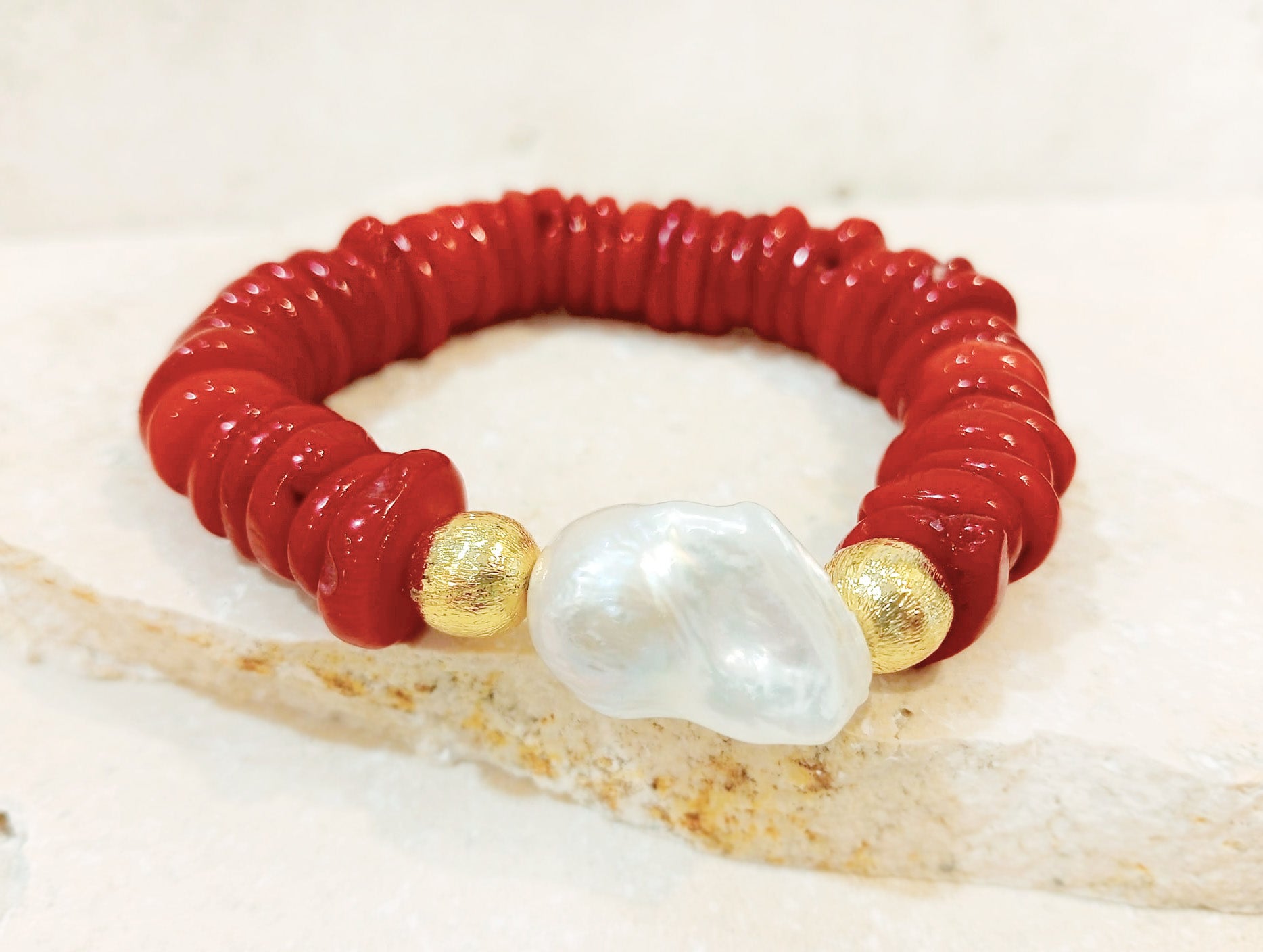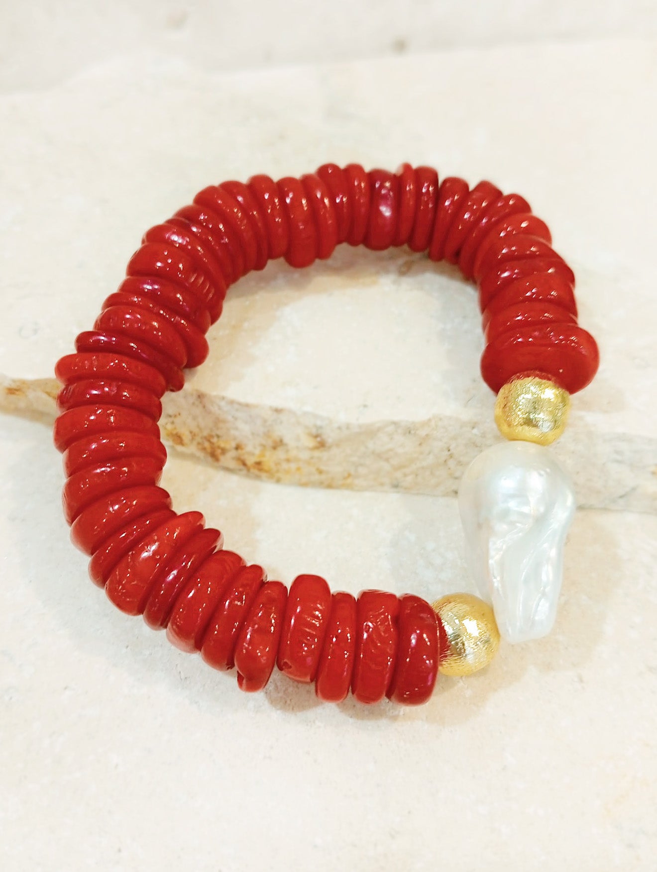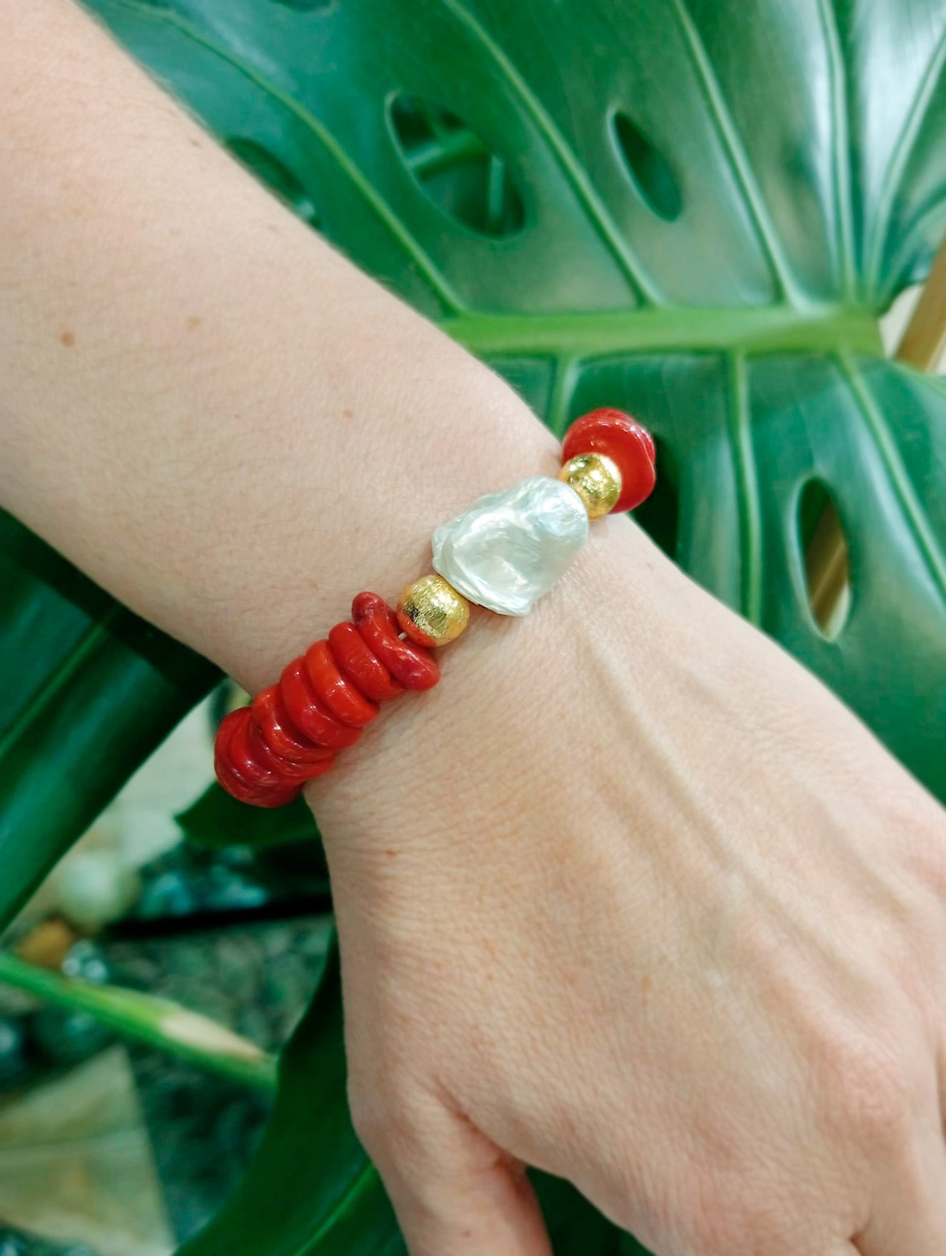 Bracelet élastique de réalisation artisanale avec perles en laiton plaqué or 24k