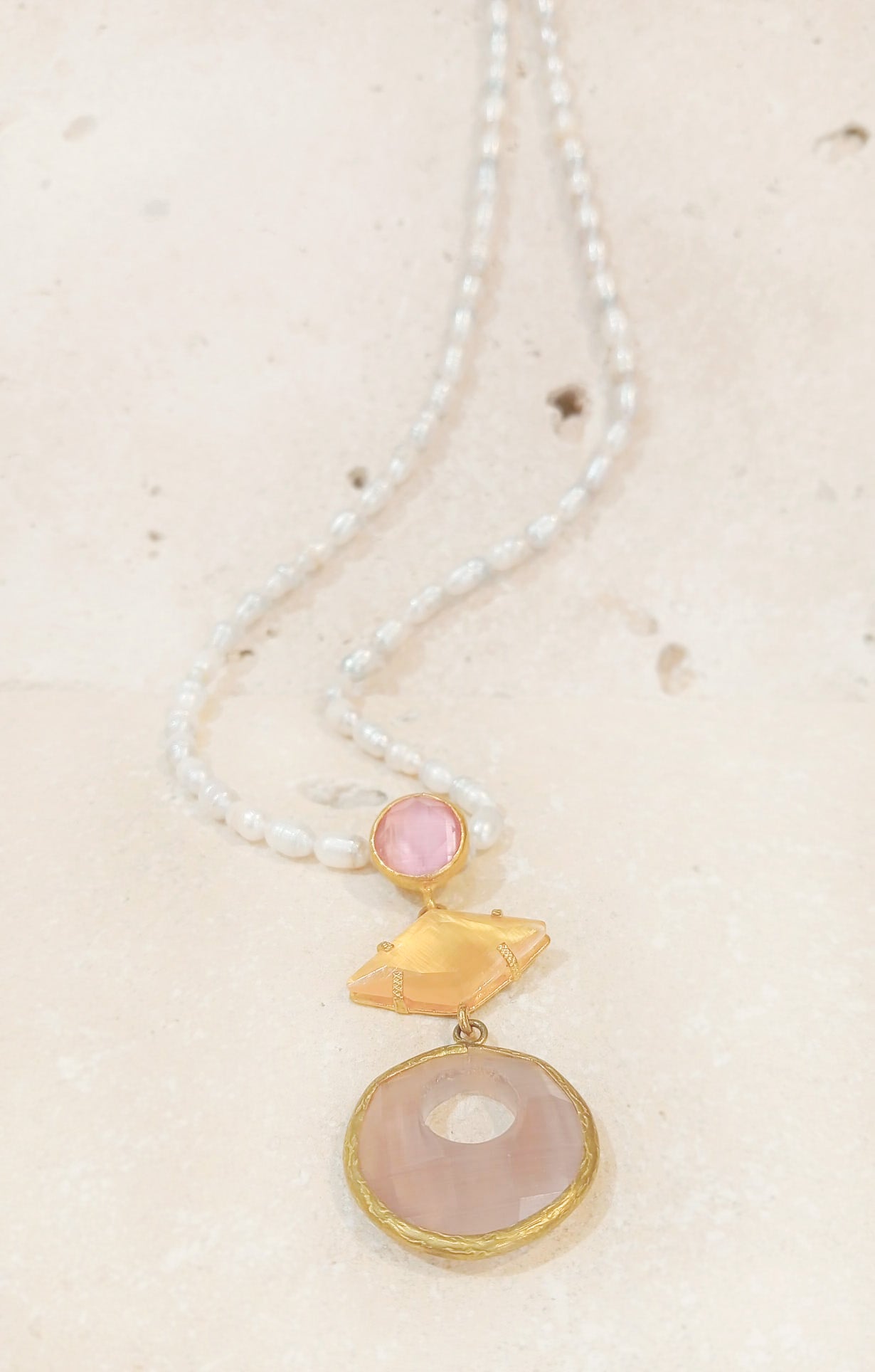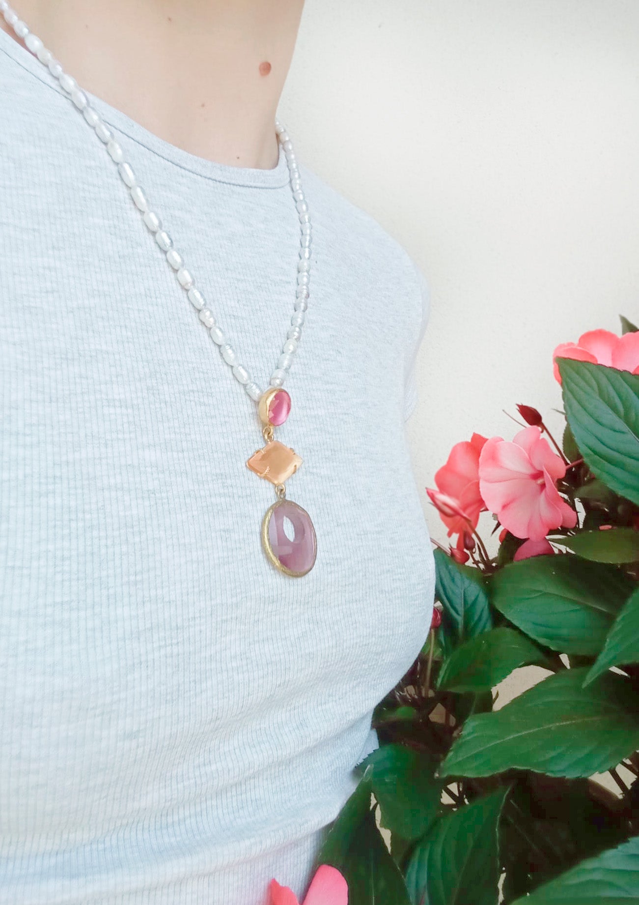 Composition: Perles d'eau douce et cristal Oeil de Chat rose, orange et marron armagnac